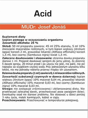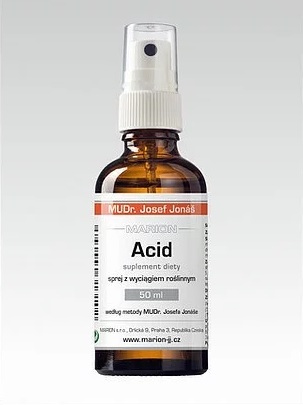 ACID - Usuwa zakwaszenie organizmu, sole biogenne, kwas moczowy, NaCl (chlorek sodu). Równowaga kwasów i zasad w środowisku wewnętrznym jest jednym z podstawowych mechanizmów homeostazy. Równowaga kwasowo-zasadowa jest dynamiczna. Oznacza to, że nasze procesy metaboliczne nieustannie zachodzą w naszym ciele. Czasami przeważają kwasy, czasem zasady, ale nasze ciało bacznie obserwuje ich równowagę, więc PH może się mieścić tylko w bardzo wąskim zakresie około 7,4. Stany znacznie powyżej tego poziomu (zasadowica) lub poniżej (kwasica) zagrażają życiu. W naszej dobrze odżywionej populacji normalnym zjawiskiem jest nadkwaśności organizmu. Oznacza to, że kwasowe metabolity (produkty metaboliczne) gromadzą się w naszym ciele. Po prostu jemy za dużo cukru, tłuszczu i mięsa w nieodpowiednich kombinacjach, proporcjach i ilościach. Niektóre pokarmy są po prostu kwasotwórcze, inne zasadotwórcze. Ale z pewnością nie oznacza to, że gdy żywność jest kwaśna, musi również być kwasotwórcza. Przeważnie bywa odwrotnie. Cukier jest kwasotwórczy a kwaśna kapusta zasadotwórcza. Nadmierne zakwaszenie organizmu niesie za sobą szereg nieprzyjemnych konsekwencji zdrowotnych. Może się pojawiać zmęczenie, ucisk w żołądku, problemy z jelitami i niestrawność, zgaga lub wzdęcia. Mogą z tym być również powiązane problemy skórne, łamliwość paznokci i włosów, próchnica zębów lub bóle głowy i pleców. Jeśli nie zmienimy diety, może dojść do poważnych zaburzeń zdrowotnych, takich jak artroza, reumatyzm, dna moczanowa, udary mózgu, hemoroidy, zaburzenia ukrwienia lub zawał serca. (Artis, Os, Urcirk, Brein, Corcirk,) Nadmierny stres palenie tytoniu i alkohol przyczyniają się również do nadkwaśności organizmu, ale również zanieczyszczone powietrze, elektrosmog, brak ruchu ale też, co ciekawe i jego nadmiar. Istnieje wiele rozwiązań. Większość ludzi cierpi na tak zwaną utajoną kwasicę. Ich ciało nieustannie walczy z kwasami, i aby je zneutralizowało, musi dotrzeć do rezerw wapnia, magnezu, potasu i sodu. Odbywa się to przez wiele lat bez zewnętrznych przejawów, ale organizm wyczerpuje się i osłabia. W szczególności wyczerpują się rezerwy minerałów, których i tak człowiek współczesny nie ma zbyt wiele, może dojść do osłabienia masy kości i do powstania osteoporozy. Zakwaszenie organizmu można redukować na kilka sposobów. Po pierwsze, poprzez zmianę sposobu odżywiania. Nie musi to być żadna drastyczna dieta. Trzeba tylko unikać pewnych potraw lub przynajmniej spożywać je w małych ilościach i tylko sporadycznie. Po drugie, można zastosować różne sposoby odkwaszania. Na rynku dostępnych jest wiele różnych alkalizujących proszków, kapsułek i napojów. W najgorszym wypadku pomoże stara dobra soda oczyszczona. Można ją rozpuścić w wodzie, najlepiej między posiłkami, lub kąpać się w niej. Regularne stosowanie ciepłej kąpieli z wodorowęglanem sodowym „wyciąga” kwas z organizmu i wywołuje bardzo przyjemne uczucie relaksu. Efekt ten jest szczególnie wyraźny po wysiłku fizycznym, kiedy mięśnie i stawy są zalane kwasem mlekowym. Preparat Acid jest jednym z podstawowych preparatów wpływając na równowagę kwasowo zasadową przyspieszając proces detoksykacji. Może być stosowany samodzielnie lub z zestawieniu z wyżej wymienionymi preparatami.